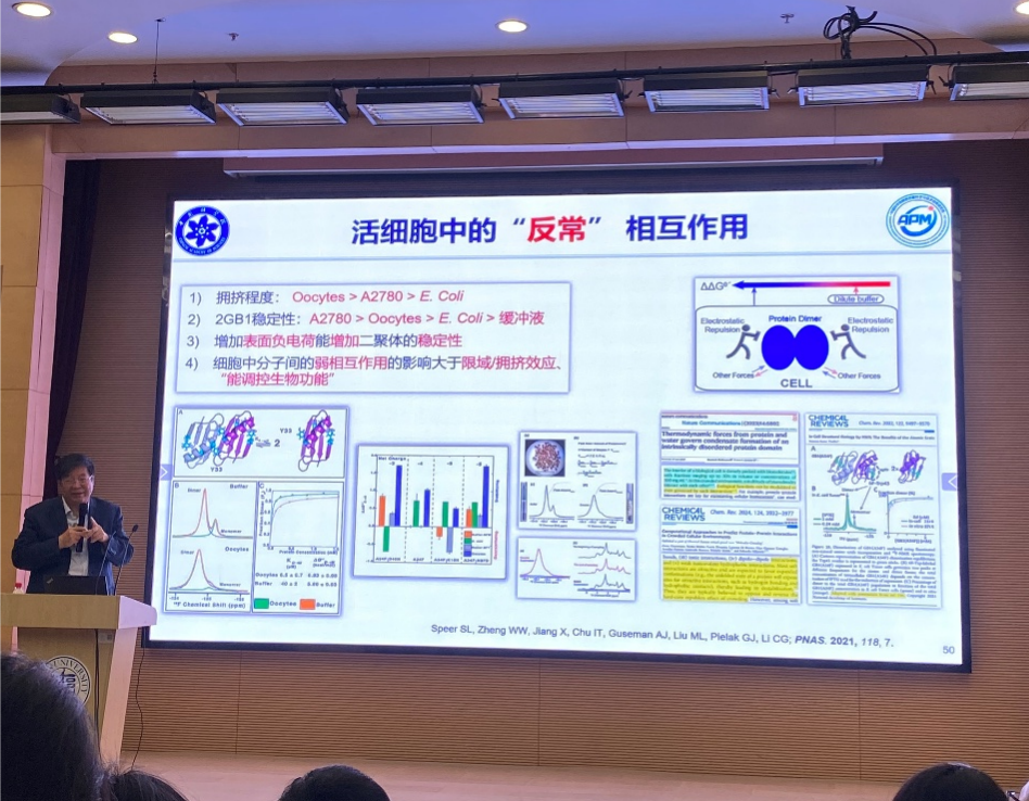 在报告中,刘买利院士首先介绍了核磁共振波谱的发展史。作为能够在接近生理条件下,从原子分辨率水平研究生物大分子结构、动力学及其相互作用的强大工具,传统的NMR技术也存在严峻挑战。针对这些挑战,刘院士结合自己多年的研究基础和工作,从生物NMR波谱分析方法、技术和应用研究等方面进行了汇报。最后总结了生物NMR波普分析的发展前景。