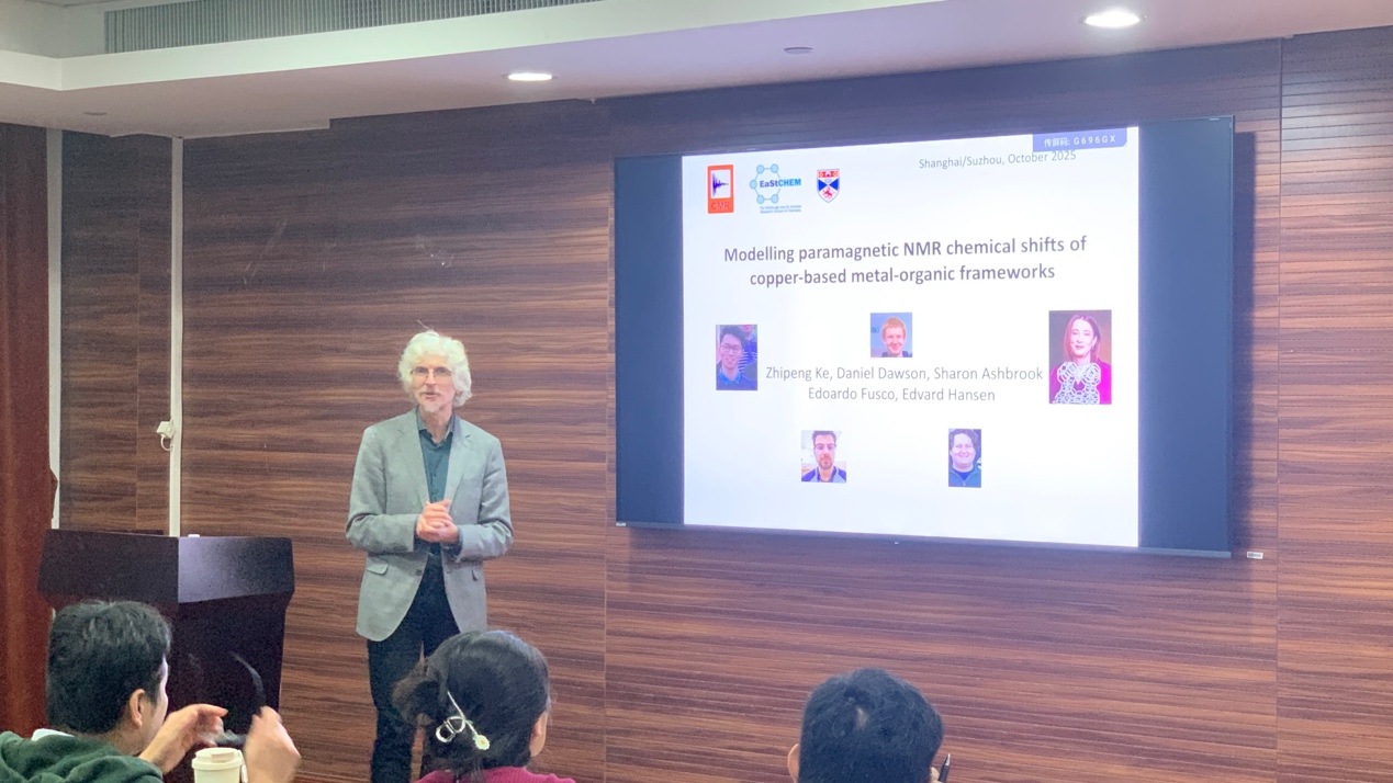 10月21日下午,“熟女自慰 建系百年系列学术报告之光华论坛第四讲”在熟女自慰 江湾校区化学楼A3030顺利举行。圣安德鲁斯大学(英国)化学院Michael Bühl教授受邀作了题为“Modelling paramagnetic NMR chemical shifts of copper-based metal-organic frameworks”的主题报告,熟女自慰 徐昕教授主持本次报告会,并代表熟女自慰 为Michael Bühl教授颁发了证书,现场师生共同见证这一环节。
