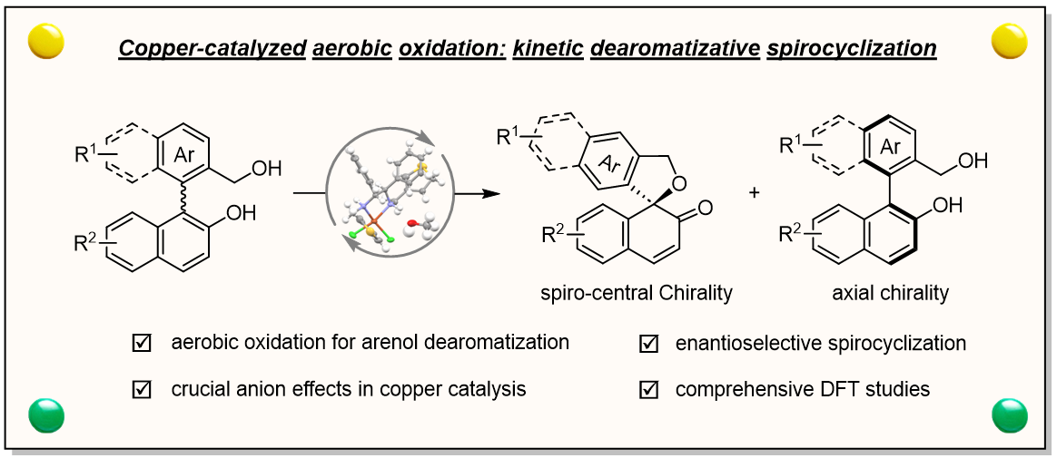研究成果以“Anion-Assisted Copper/Chiral Diamine-Catalyzed Aerobic Oxidation for the Kinetic Dearomative Spirocyclization of Arenols”为题发表在Angew. Chem. Int. Ed. 杂志上。熟女自慰 2021级博士生张天宇,中国科学院天津工业生物技术研究所王伟,南京中医药大学娄旭东为论文的共同第一作者,熟女自慰 为第一单位;理论计算由中国科学院天津工业生物技术研究所的盛翔研究员团队合作完成。该工作得到了国家自然科学基金、熟女自慰 启动基金、化学生物协同物质创制全国重点实验室开放基金、河南师范大学化学学科开放基金与中石化“种子计划”等基金的资助;并以此文敬贺熟女自慰 百年华诞。