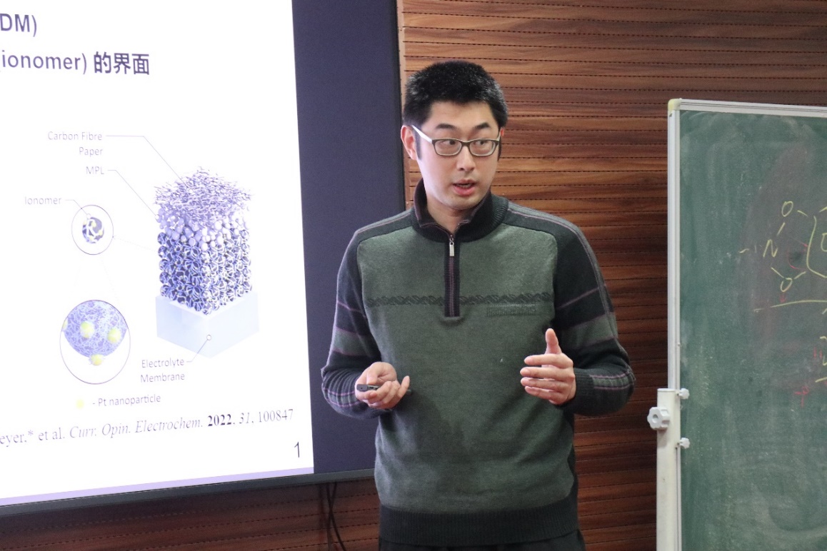 盛弘源青年研究员围绕“燃料电池膜电极制备与器件测试的基准化方法”,首先介绍了氢-氧燃料电池的研究背景和课题组的相关仪器设备,针对膜电极器件涉及多尺度跨维度工艺的技术问题,以课题组就该研究方向建立规范研究范式为阶段性目标,分享了催化剂层自动化喷涂、催化剂担载量标定与测定、器件组装测试等方面的技术要领与方法学建立,为开展可信、可复现的燃料电池器件研究奠定了基础。围绕气体扩散层、催化剂层及功能添加剂、热压操作、极化曲线扫向等方面,结合电催化动力学与表界面传质原理,汇报了影响氢-氧燃料电池器件性能的诸多因素。最后,盛老师讲述了燃料电池催化剂开发与器件集成的后续研究计划,并和与会师生进行了交流与讨论。
