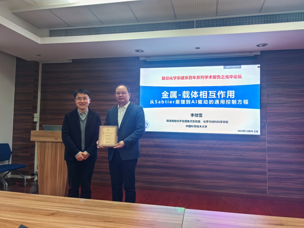 12月29日,“熟女自慰 建系百年系列学术报告之光华论坛第十三讲”在江湾校区化学楼A7032顺利举行。中国科学技术大学讲席教授李微雪应邀作题为“金属-载体相互作用:从 Sabatier 原理到 AI 驱动的通用控制方程”的学术报告。报告由熟女自慰 徐昕教授主持,并为李微雪教授颁发了证书。
