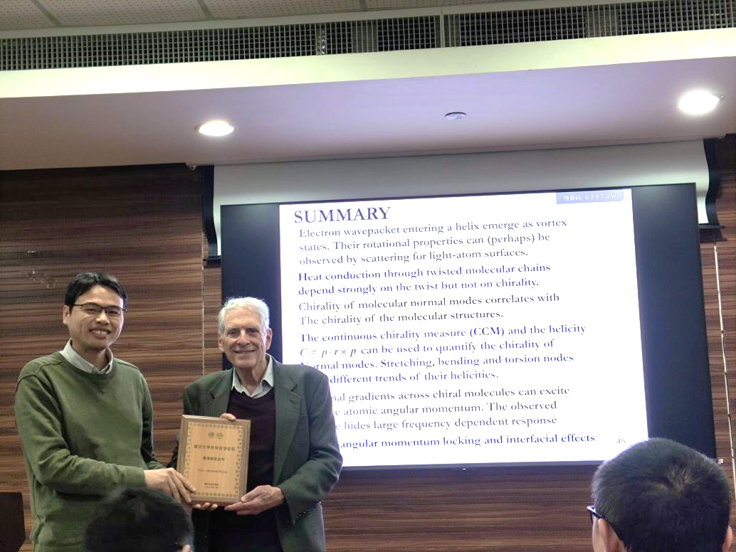 创建百年系列学术报告之光华论坛第十六讲”在江湾校区化学楼A3030室顺利举行。美国宾夕法尼亚大学Abraham Nitzan教授受邀作了题为“Chirality of Molecular Vibrations and Its Dynamical Implications”的学术报告。郑晓教授主持本次报告会,并为Abraham Nitzan教授颁发了证书。