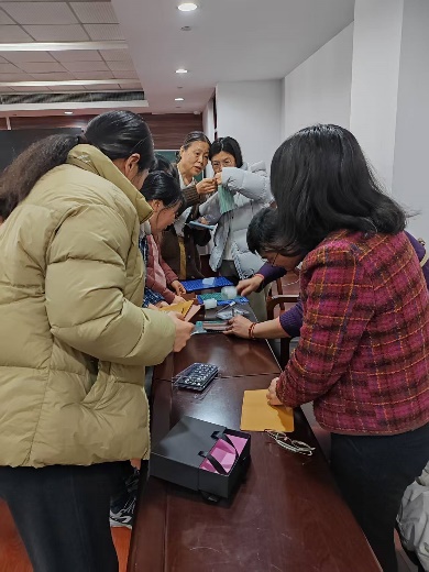 活动现场桌面上整齐摆放着牛皮面料、针线等手工材料,专业裁缝老师现场教学,耐心指导,手持针线逐一示范印字、缝合、包边等核心技巧,针对细节问题逐一讲解。女教职工们围坐在一起,低头专注穿针引线,指尖细细打磨作品,有的两两结伴交流制作心得,有的对着半成品认真比对尺寸,眉眼间满是专注与笑意,定格下一幅幅温柔又治愈的画面,全程欢声笑语不断,暖意萦绕全场。