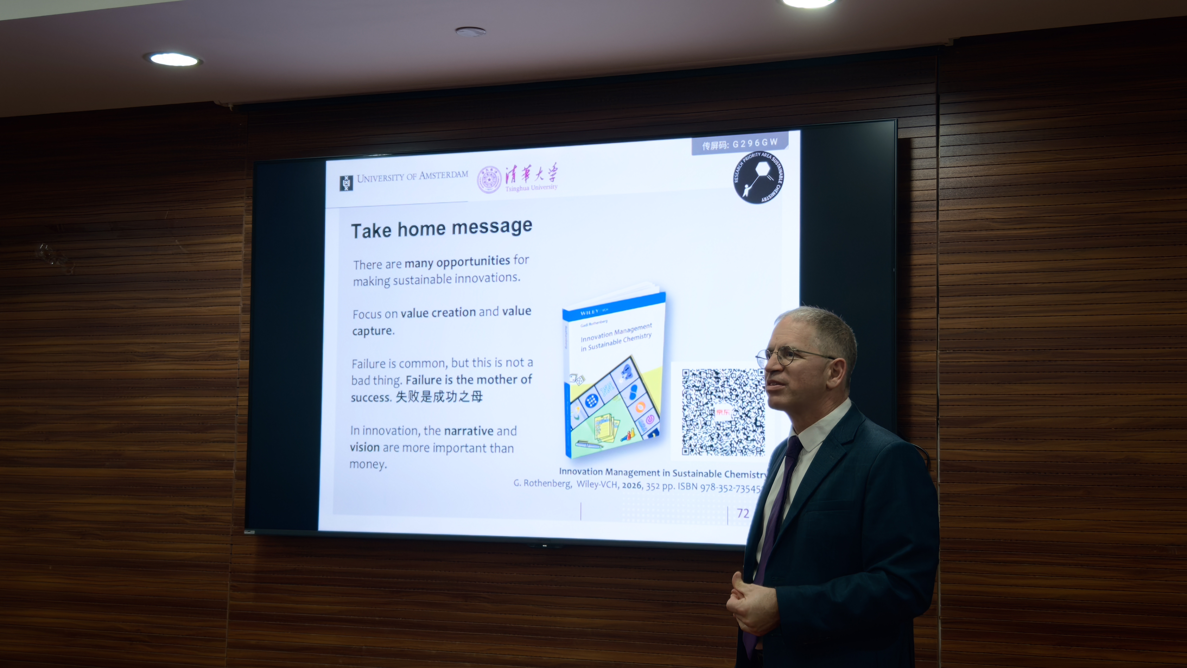 Gadi Rothenberg教授围绕可持续化学中创新管理的研究方向,分享了如何将科学发现转化为成功商业项目等方面的系列成果。他结合科学理论与商业实践等方面,详细介绍了可持续化学的关键原则与驱动因素,及其与可持续发展的关系。并探讨了如何将创新成果转化为可行且可持续的商业项目。核心议题包括:商业原型、商业模式、创新叙事,以及知识产权战略、团队组建等实践层面。在项目过程中,教授强调以一个好的视角去讲好一个故事,以及拥有不惧怕失败的勇气与决心是至关重要的。此外,Gadi Rothenberg教授还详细阐述了探讨了可持续初创企业的融资渠道,并以微生物二氧化碳转化的真实案例进行阐释,来洞察其背后的逻辑与意义。